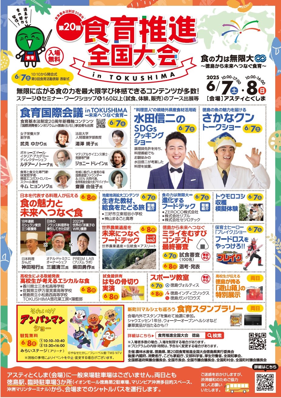 毎年6月の「食育月間」の全国的な取組として、農林水産省が今年は徳島県等との共催により、6月7日(土曜日)、8日(日曜日)の2日間にわたって、食育の「今」と「未来」を体感できるイベントをお届けします。